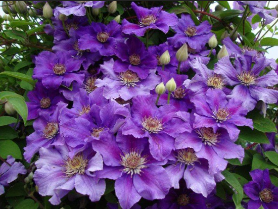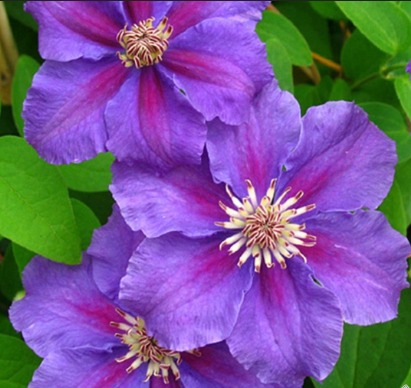 Клематис Ашва крупноцветковый (3) - это компактный сорт, достигающий высоты 1,5-2,0 метра. Его пурпурно-фиолетовые цветки округлой формы с красной полоской посредине лепестка и более темным основанием привлекают внимание своей красотой. Цветки диаметром 5-8 см, состоящие чаще всего из 6 почти круглых чашелистиков с замысловато изогнутыми краями. Тычинки с пурпурными пыльниками на бело-розовых нитях. Клематис Ашва обильно цветет на побегах текущего года, что делает его отличным вариантом для выращивания в контейнерах. Зона зимостойкости: 4 (-35 °С).