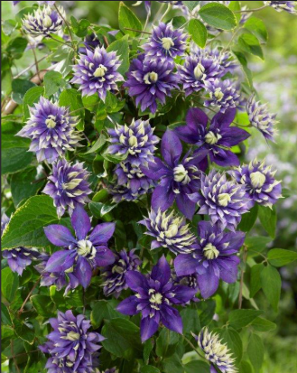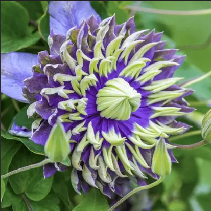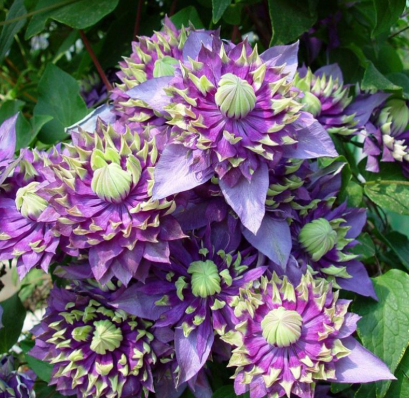 Клематис Тайга махровый (3) - это новый японский сорт, который отличается очень необычными цветками. По мере их распускания меняется не только цвет, но и форма. Бутоны раскрываются в несколько этапов. Сначала раскрываются самые крайние крупные лепестки, окрашенные в сиренево-фиолетовые тона. Затем распускается серединка - мелкие лепестки более яркого пурпурно-фиолетового цвета с желто-зелеными или лимонными кончиками, часть из которых может быть скручена в трубочку. В последнюю очередь становится заметной желтая сердцевинка. Цветки диаметром 12-15 см. Листья темно-зеленые, с ровными краями, эллипсовидные, сердцевидные или тройчатые. Высота растения 2-2,5 м, может выращиваться в контейнерах. Период цветения: с июня по сентябрь. Зона зимостойкости: 6 (-23°C).
