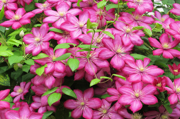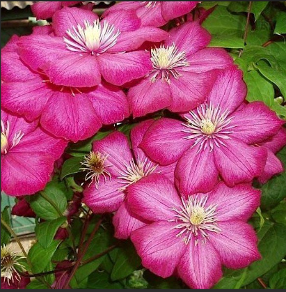 Клематис Виль де Лион крупноцветковый (3) Цветки диаметром 12-15 см с овальными, волнистыми по краям лепестками. Цветки округлые, ярко-карминовые с золотистыми тычинками. Цветет обильно и продолжительно, с июня по сентябрь. Отличный вариант для выращивания в контейнерах. Зона зимостойкости: 4 (-35 ° С).