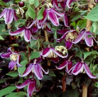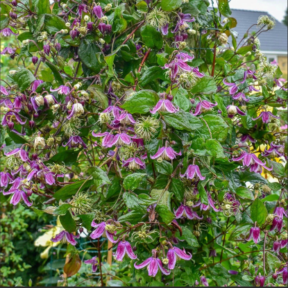 Клематис Ян Фопма мелкоцветковый (3) - Высота до 150 см, диаметр цветка 4-6 см. Цветки сиренево-фиолетовые с пурпурным оттенком в форме колокольчика. Не прихотлив, растет быстро, укрытия на зиму не требует. Имеет приятный аромат! Цветение - июль-сентябрь