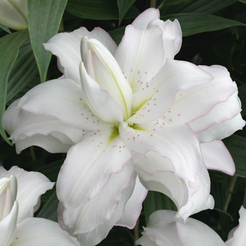 Лилия восточная Лотус Бьюти входит в новейшую серию лилейных культур, с похожими на лотос цветками. Сорт ослепляет белизной нежнейших лепестков. Цветение лилии в жару дает визуальный охлаждающий эффект.