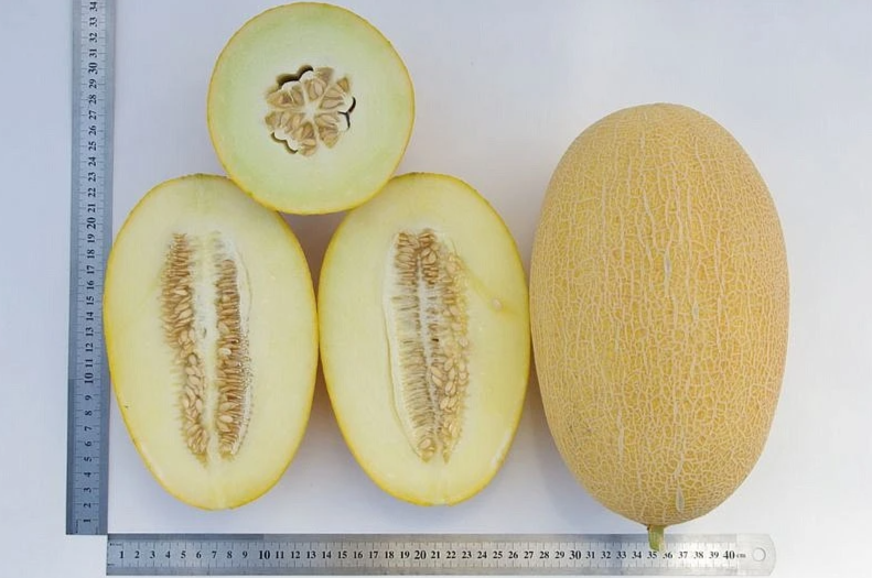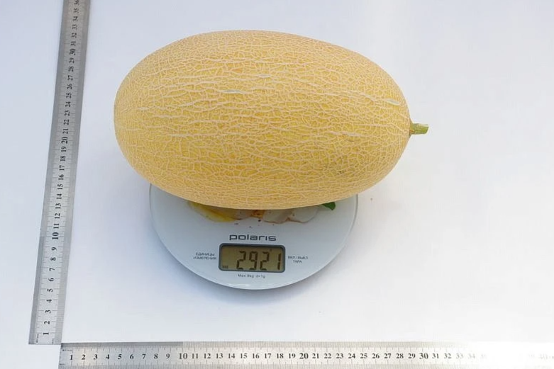 Средний вес плодов составляет 1,5-2,0 кг. Плоды превосходного качества, овальной формы, ярко-желтого цвета с выраженной сеткой. Мякоть белая и нежная, очень сладкая, с характерным ананасным вкусом, ярким и сильным. Семенная камера небольшая.