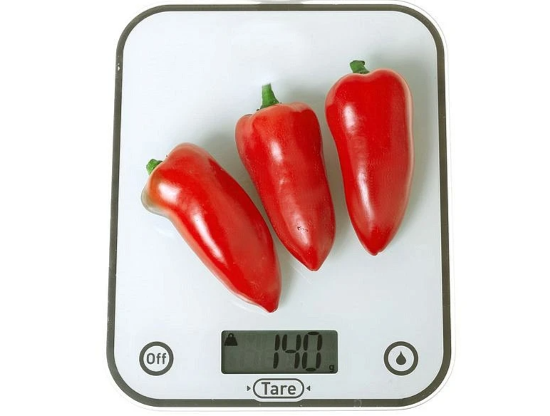 Плоды глянцевые, яркие, конической формы, насыщенно-красного цвета, длиной 8-10 см и массой 45-55 г. Плоды очень ароматные, сладкие, с толщиной стенки 4-5 мм.