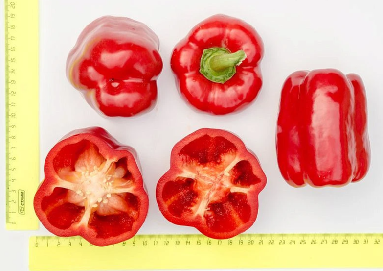 Плоды ярко-красного цвета, кубовидной формы, крупные, массой более 220 г, с толщиной стенки до 12 мм, выравненные по форме и размеру. Перцы обладают превосходными товарными и вкусовыми качествами, великолепно подходят для приготовления лечо и потребления в свежем виде.