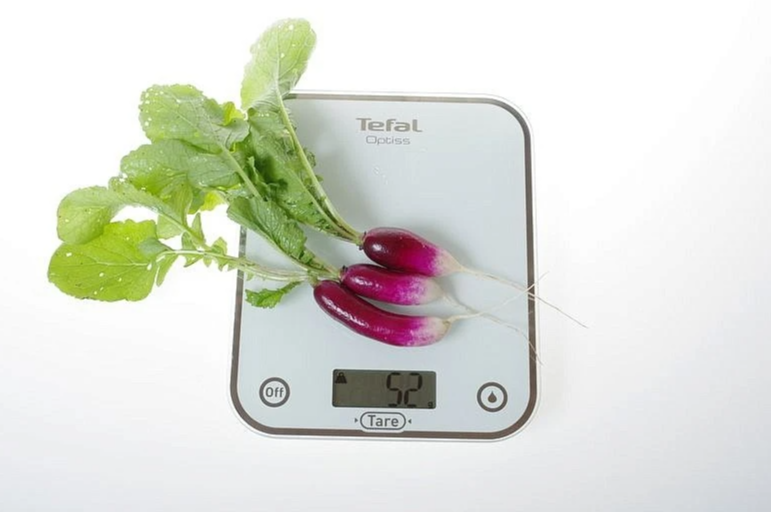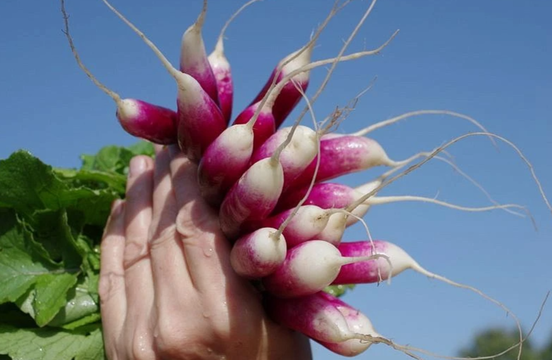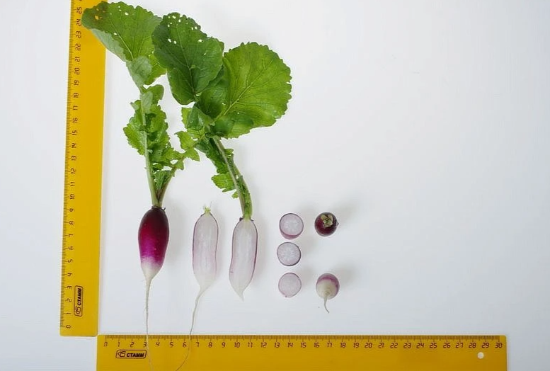 Редис имеет удлиненно-цилиндрическую форму, массу 25-35 г. Кожица у корнеплодов тонкая, нежная, красивого ярко-фиолетового цвета с белым кончиком. Мякоть редиса белая, сочная, хрустящая, сладковатая на вкус. Корнеплоды содержат антоцианы.