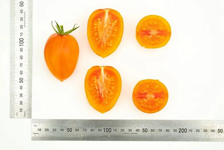 Томаты ярко-оранжевого цвета с тонкими размытыми штрихами, мякоть очень нежная, сладкая, с повышенным содержанием каротина и сахаров, хороши для свежего потребления, цельноплодного консервирования и вяления, транспортабельные.