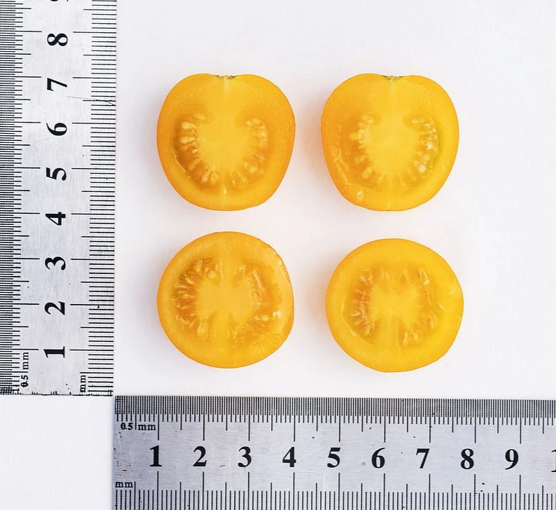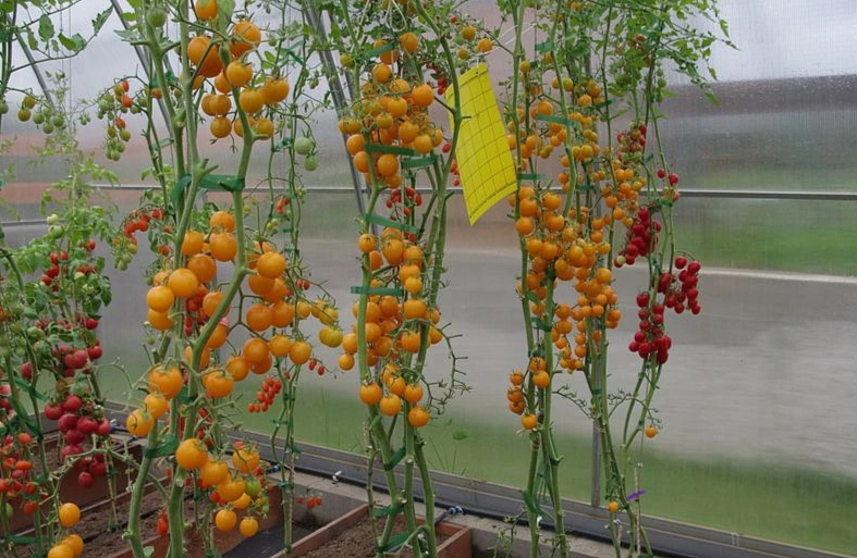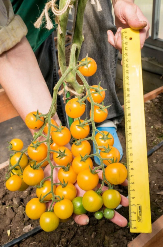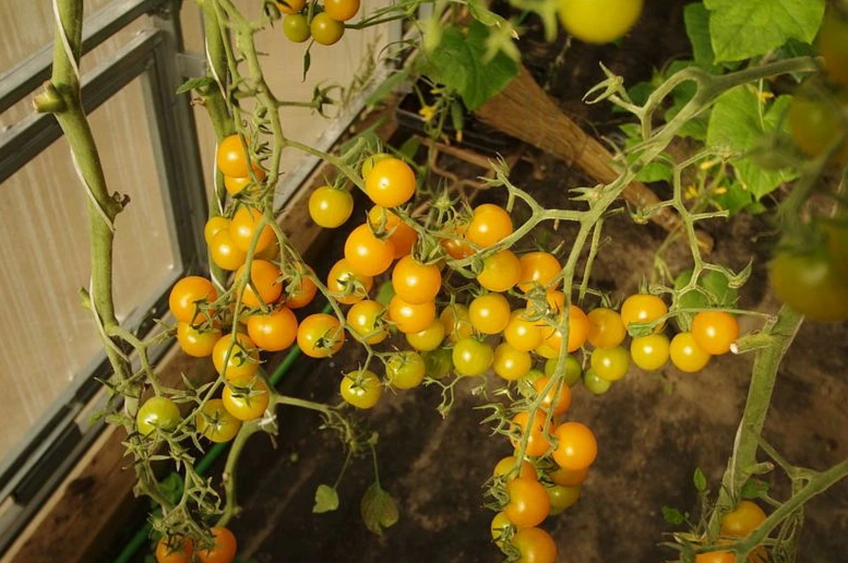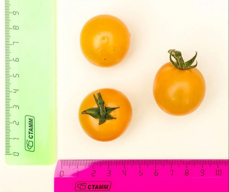 В плодоношение вступает через 95 дней после всходов. Первое соцветие закладывается над 9 листом, последующие – через каждые 2 листа. В простых и сложных кистях формируется по 20 и более округлых плодов аппетитного желтого цвета, массой 20-25 г.