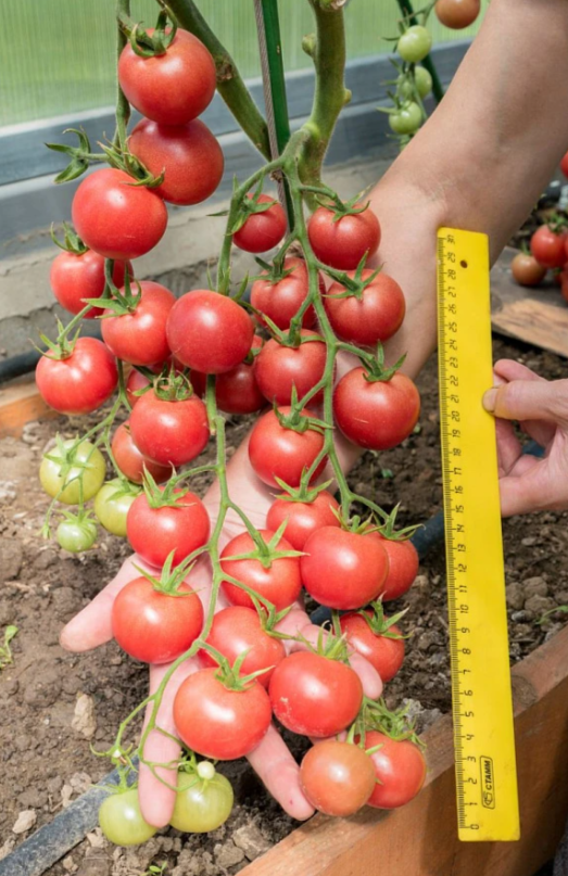 От всходов до начала плодоношения проходит примерно 95 дней. Растение мощное, интенсивной силы роста. Первое соцветие закладывается над 9-м листом, последующие — через 2-3 листа. В простых и полусложных кистях формируется по 10-20 выравненных округлых плодов розового цвета, массой 35-40 г.