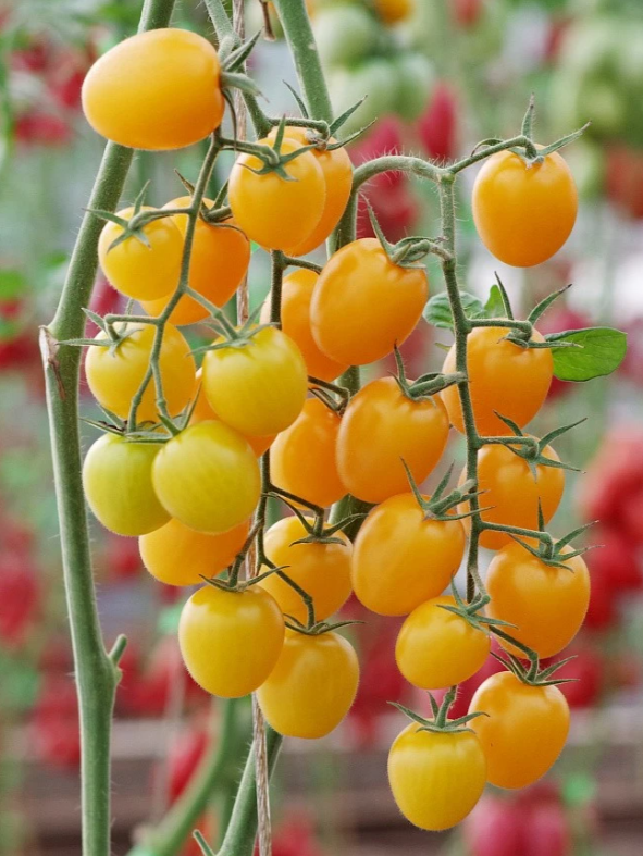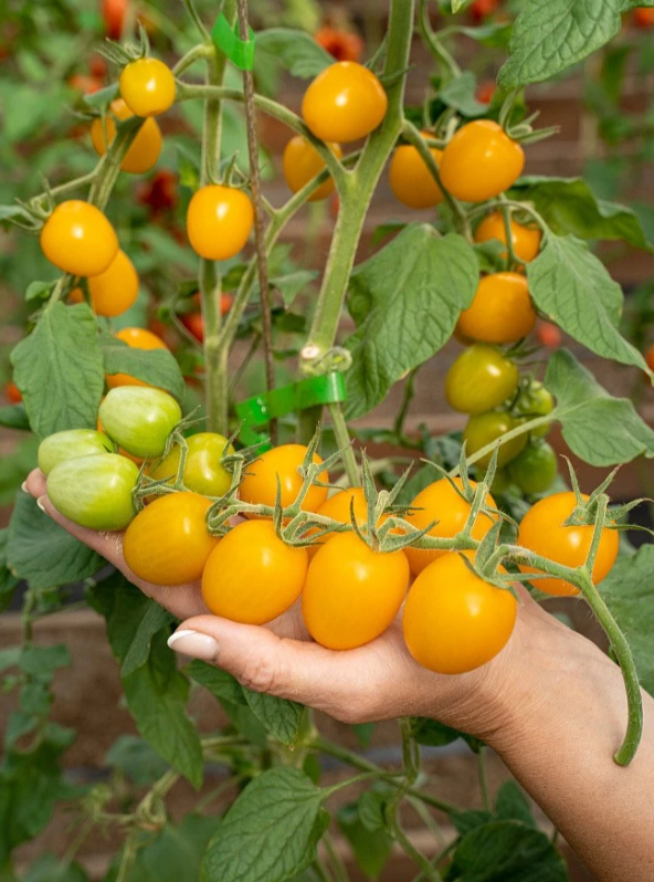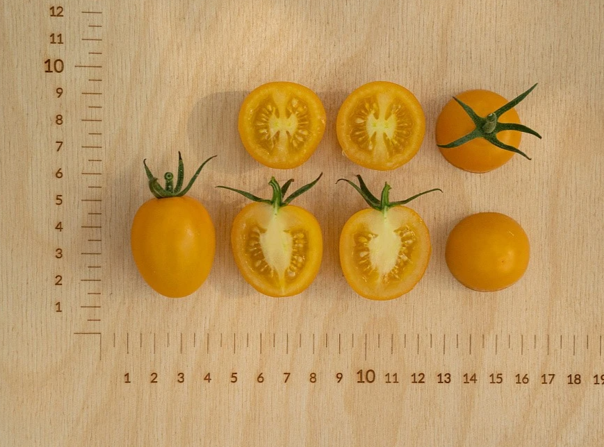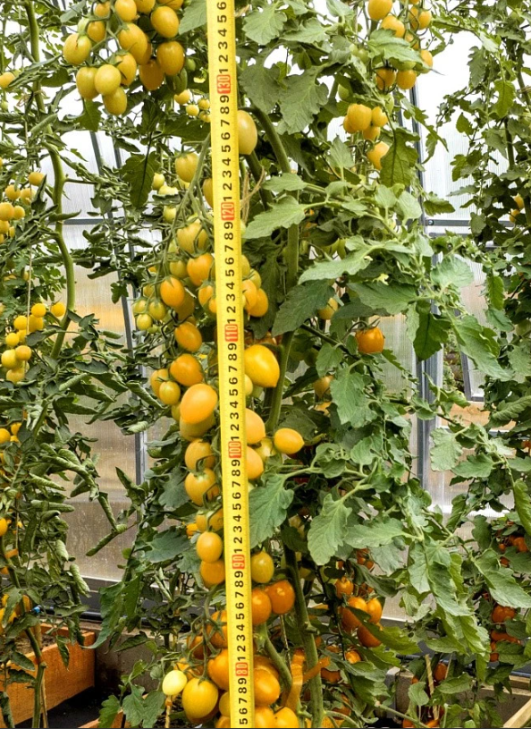 От всходов до начала плодоношения проходит 90-95 дней. Растения имеют картофельный тип листа. Первое соцветие закладывается над 7 листом, последующие – через 1-2 листа. В простых красивых кистях закладывается по 8-12 обратнояйцевидных плодов ярко-желтого цвета, массой около 30 г.