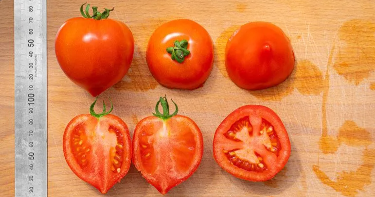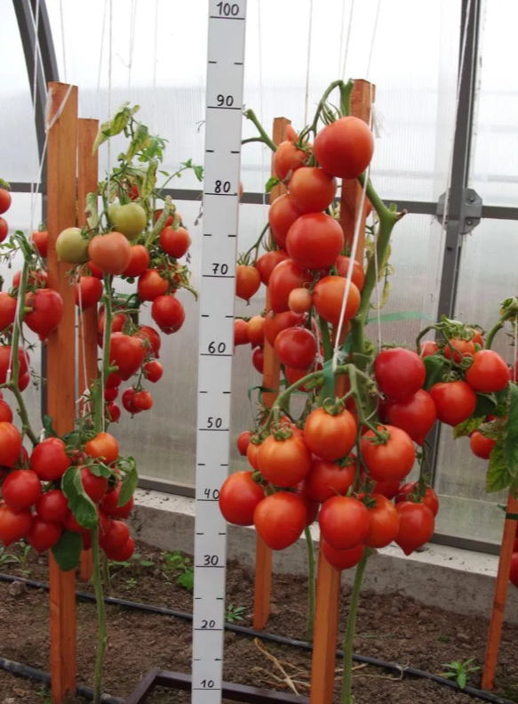 Первое соцветие закладывается над 7 листом, последующие — через 2 листа. Кисти простые и полусложные с крупными плодами округлой формы с носиком, красного цвета, массой около 200 г.
