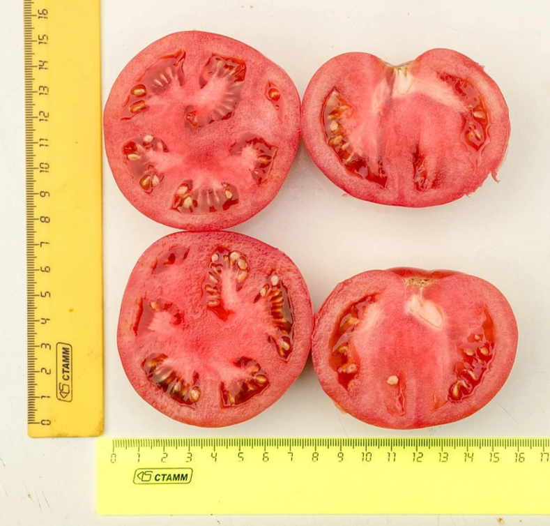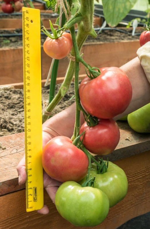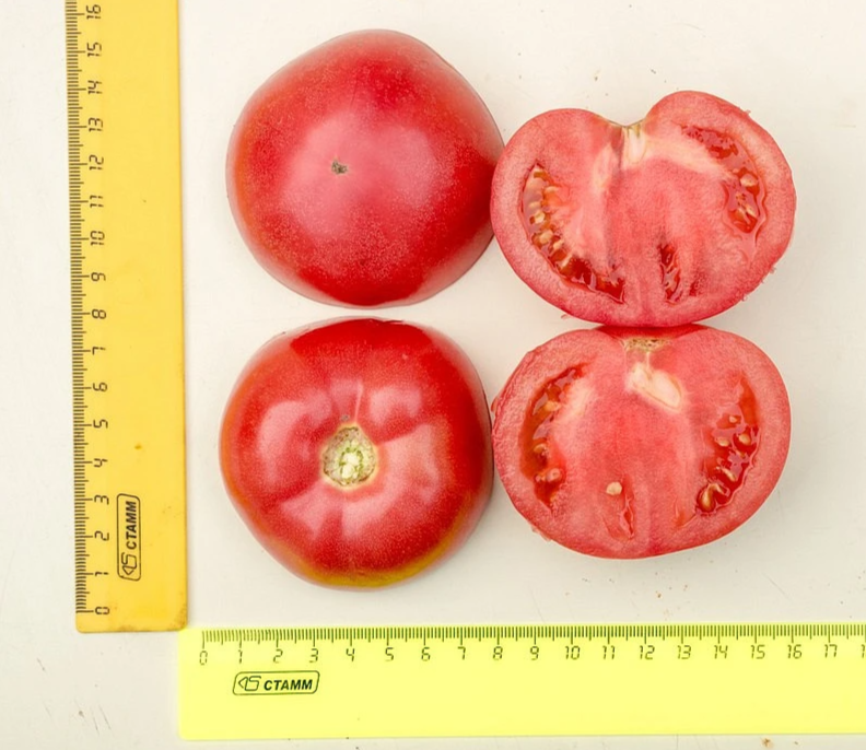 Среднеранний индетерминантный гибрид биф-томата. От всходов до начала созревания проходит 105-110 дней. Растение умеренной силы роста, с укороченными междоузлиями. В простой кисти формируется по 5-7 розовых крупных плоскоокруглых томатов массой 250-400 г.
