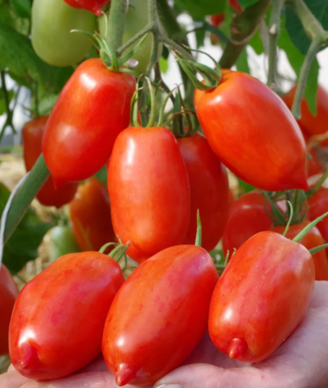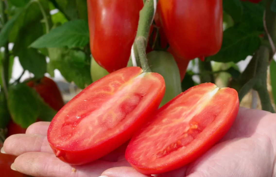 Растение среднеоблиственное, средней силы роста, высотой около 80 см. Первое соцветие закладывается над 6 листом, последующие – через 1 лист. В простых кистях формируется по 7-8 плодов цилиндрической формы с носиком. Томаты массой 70-100 г, насыщенного красного цвета с размытыми золотистыми полосками, глянцевые, плотные, с прочной кожицей, идеально подходят для употребления в свежем виде, цельноплодного консервирования, приготовления соусов и вяления.