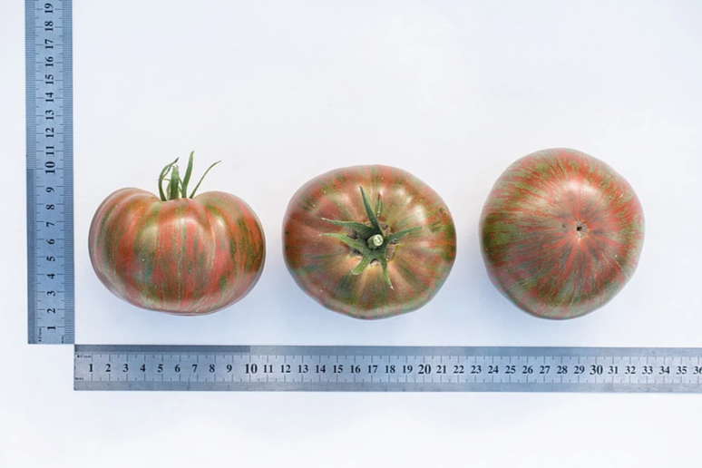 Плоды плоскоокруглой формы, многокамерные, массой 250-350 г, мякоть плотная, семенные камеры небольшие. Поверхность томатов гладкая, глянцевая, окрашена в густо-оранжево-бордовый цвет с оливковыми полосками и штрихами. Вкус очень приятный, сладкий, с насыщенным фруктовым ароматом.