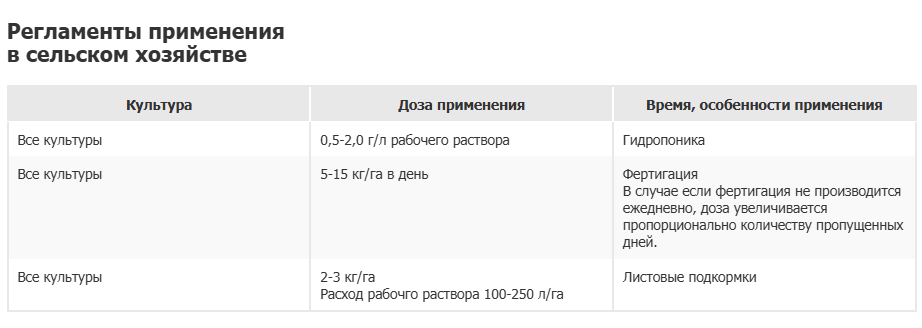 Средство вносится с поливом или в форме листовой подкормки. Это позволяет культурам максимально эффективно впитывать действующие вещества и использовать их для роста и развития. Выпускается в форме порошка, полностью растворимого в воде.